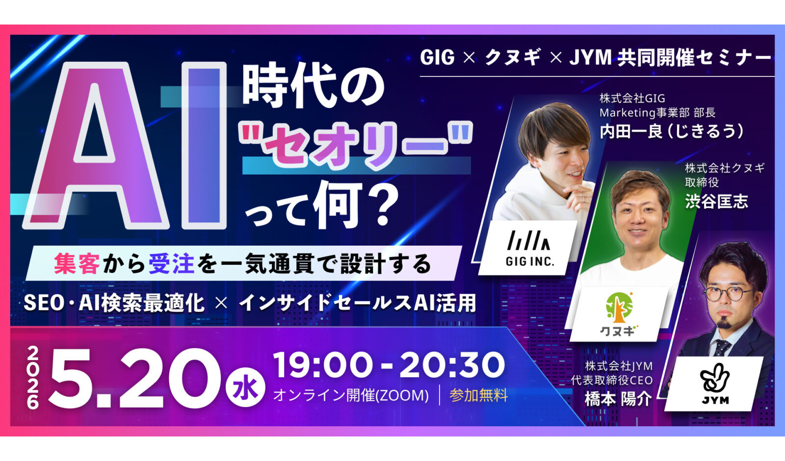 【タイムテーブル】 ・19:00〜19:20_株式会社GIG「AI検索時代のブランド設計とコンテンツ最適化」 ・19:20〜19:40_株式会社クヌギ「AIがSEO/LLMOの現場を変えた」 ・19:40〜20:00_株式会社JYM「年間70万コールをする弊社が検証した、インサイドセールスでAIに任せて良いこと・ダメなこと」 ・20:00〜20:30_パネルディスカッション・質疑応答