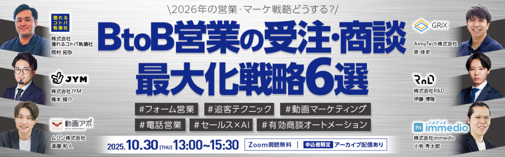・テーマ:\2026年の営業・マーケ戦略どうする?/ BtoB営業の受注・商談最大化戦略 6選 ・開催日時:2025年10月30日(木)13:00〜15:30 ・開催場所・方法:オンライン(Zoom) ・費用:無料 ・企画・運営:株式会社獲れるコトバ執筆社 ・申し込み方法:こちら詳細URLよりお申込みください。