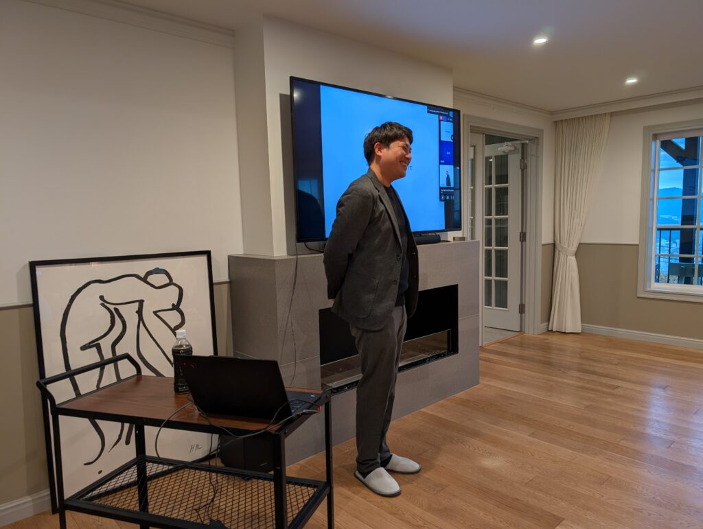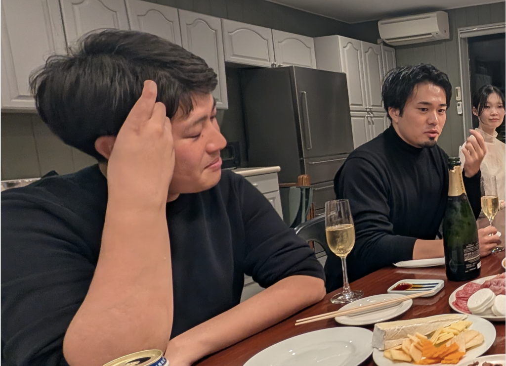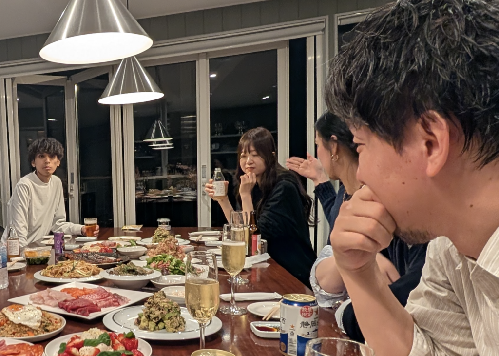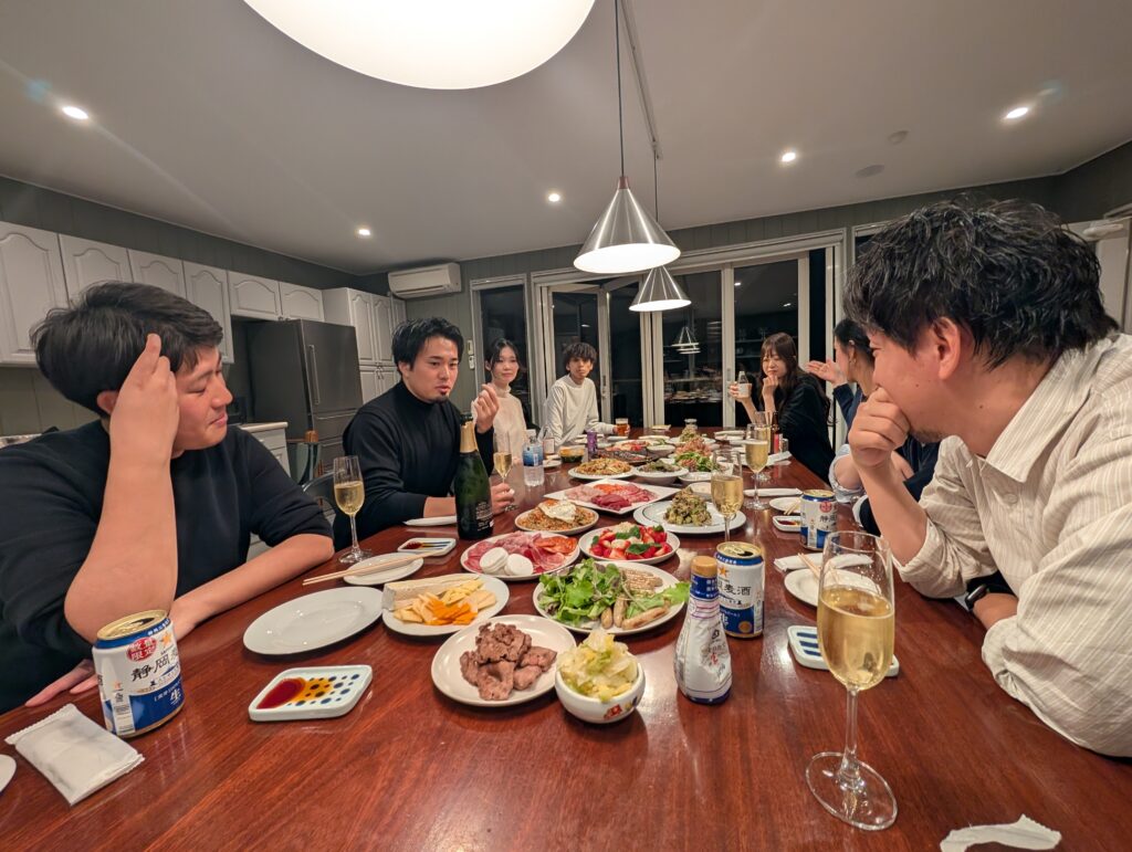 そんな美味しいご飯を食べ、お酒をかたむけながら、新しく入ってきたメンバーも含めて各人のことについて色々みんなで語り合いました。代表の橋本の話も熱が入りみんなも聞き入ってますね。